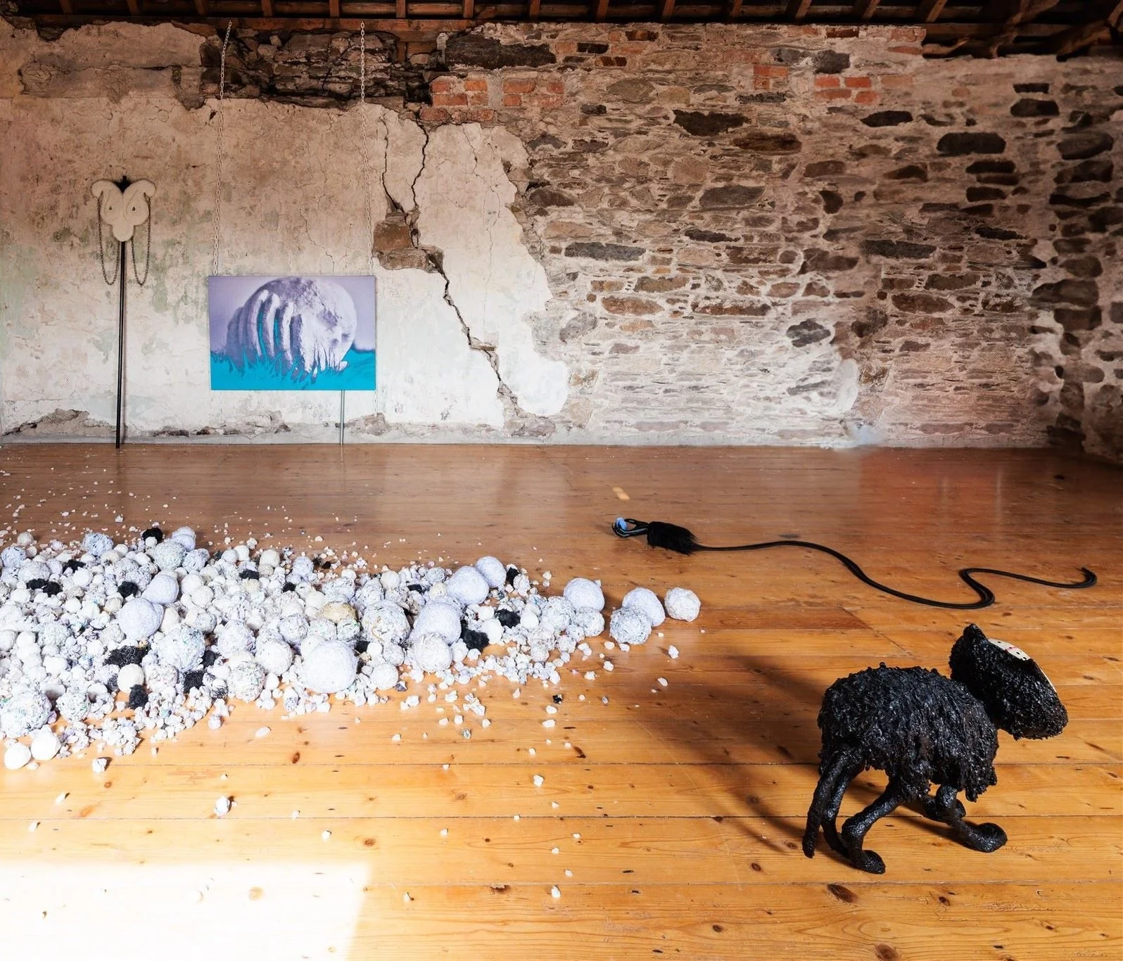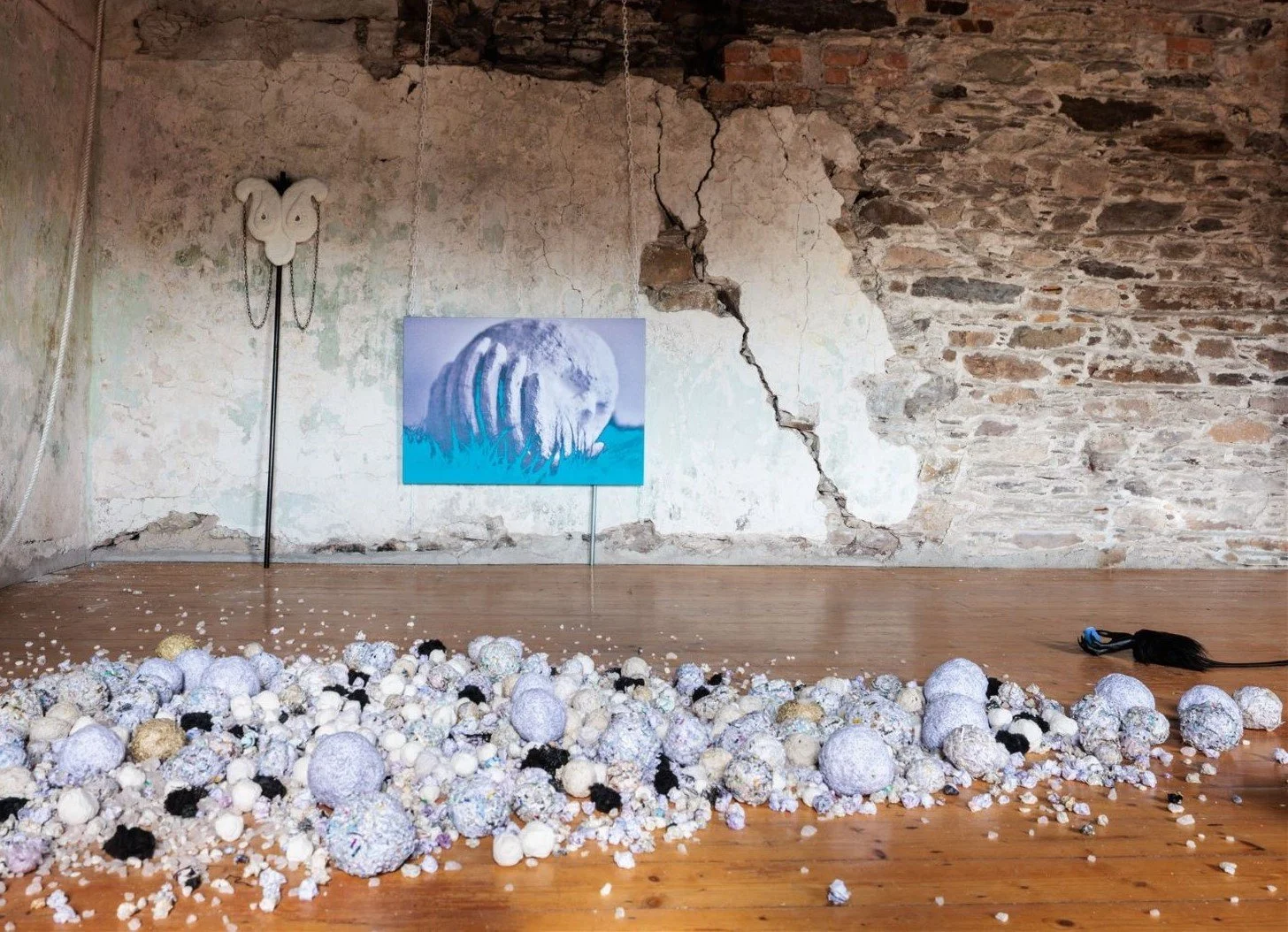 ‘Curing stick’ 2025 carboard, epoxy clay, chain, faux fur, wood, plastic ‘Seat in blue 1’ 2019-2025 Digital print on stretched cotton canvas, plastic chain