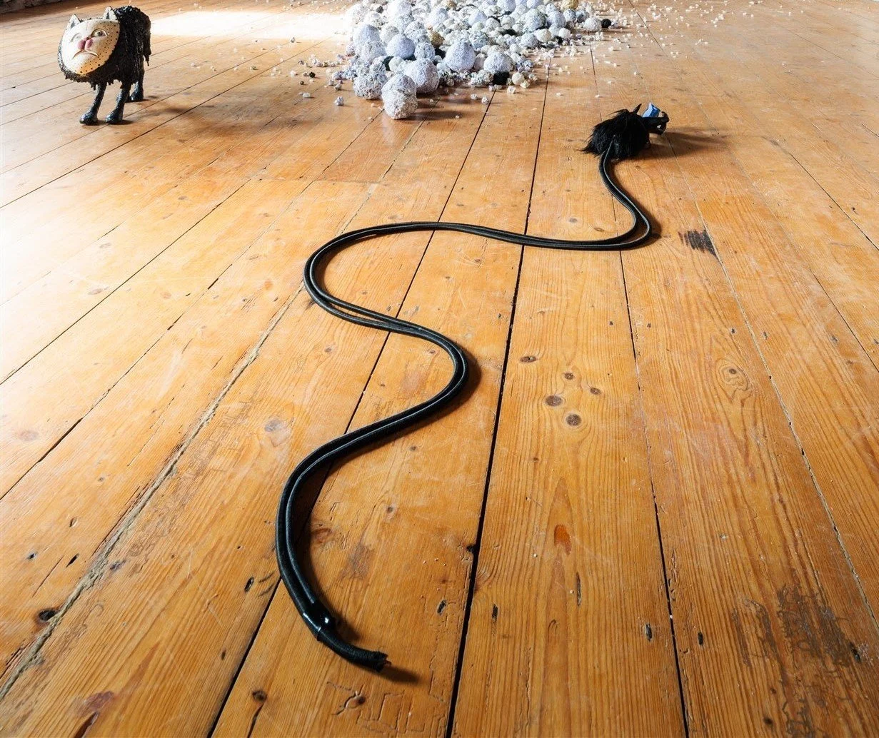 ‘Curing stick’ 2025 carboard, epoxy clay, chain, faux fur, wood, plastic
